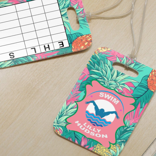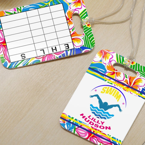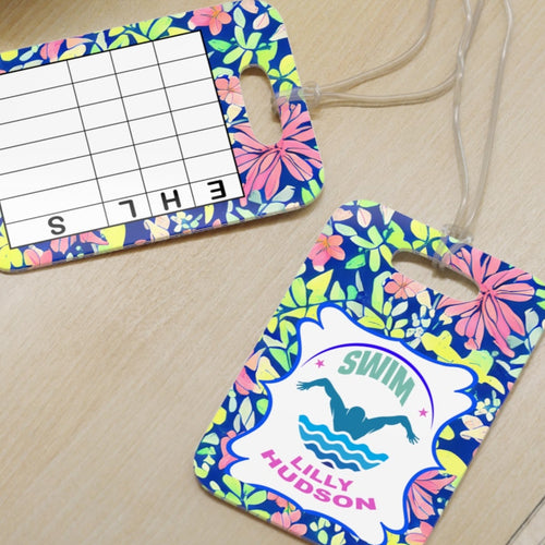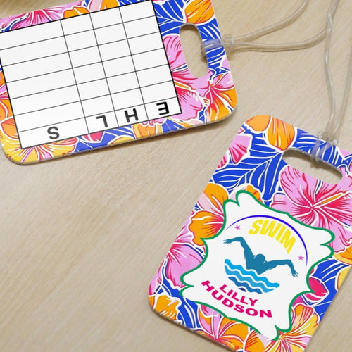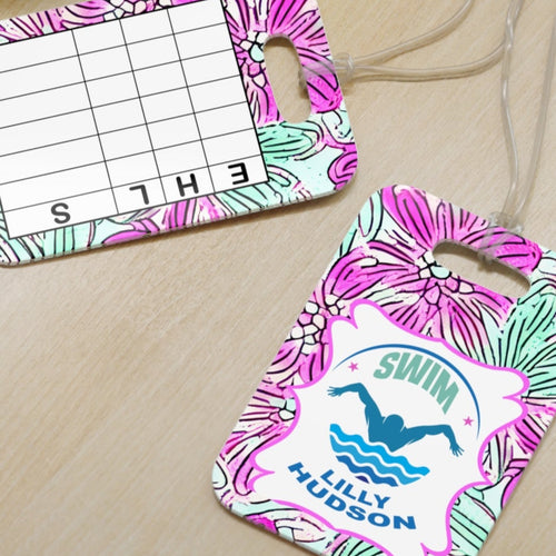 Personalized Lilly 9 Floral swim bag Tags with swim meet heat/ Custom Reusable swim meet heat Tags