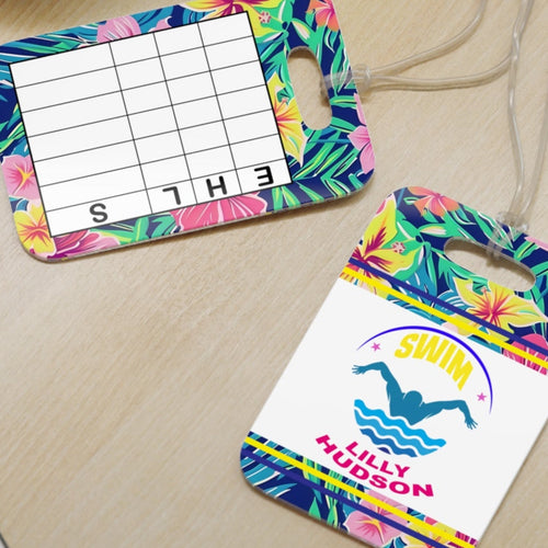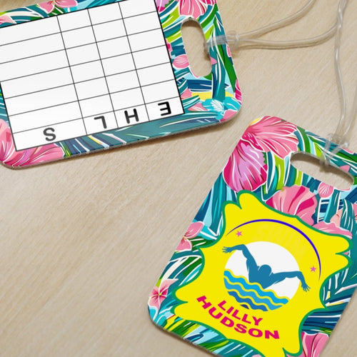 Personalized Lilly 2 Floral swim bag Tags with swim meet heat/ Custom Reusable swim meet heat Tags